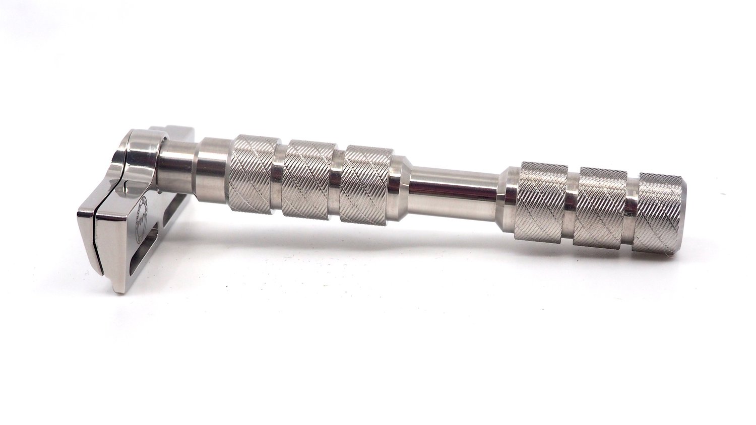 An all stainless steel Single Edged razor. The Claymore Evolution is fully machined in 316L stainless steel then the surface is HIGHLY POLISHED.