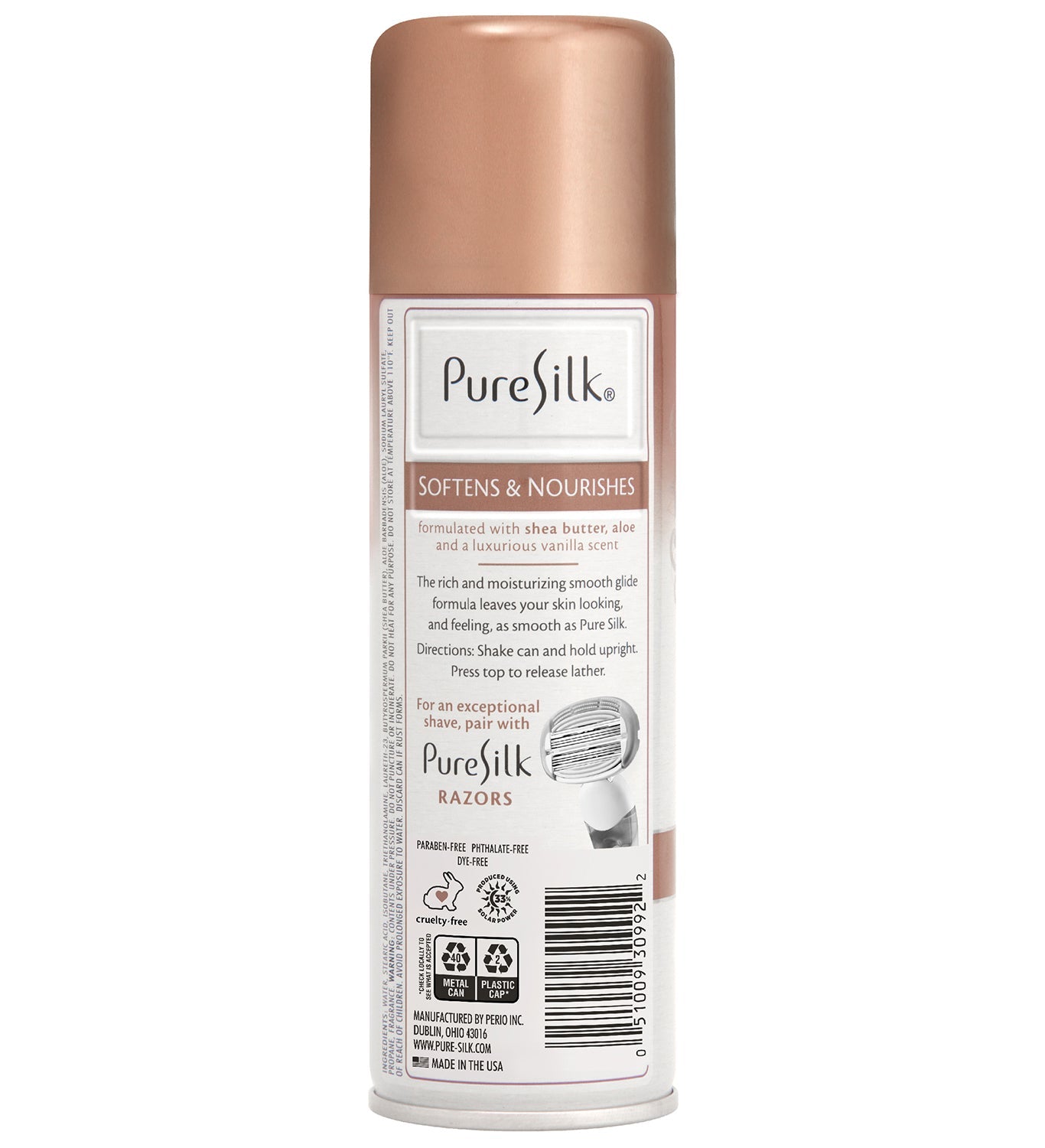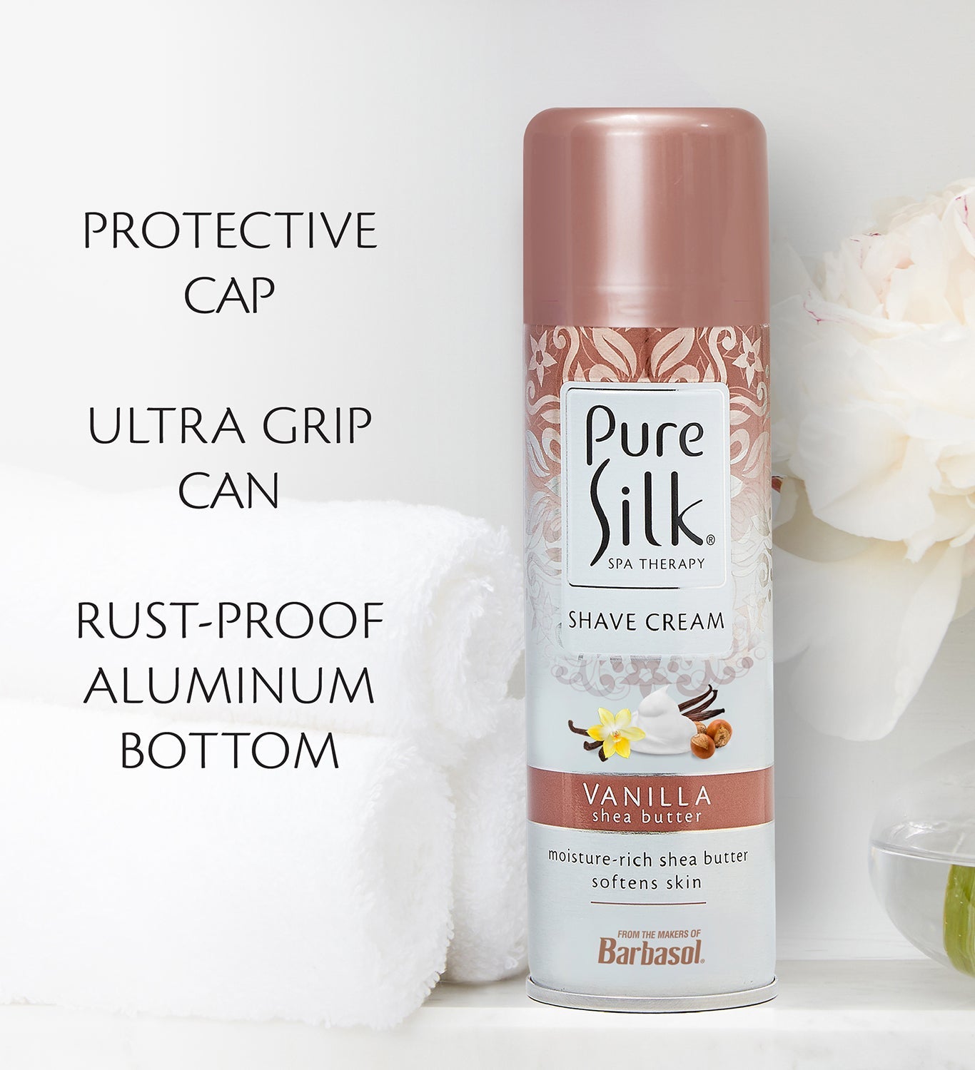Formulated with shea butter, aloe and a luxurious vanilla scent to soften and nourish skin. Pure Silk Vanilla Shea Butter Shave Cream protects and nourishes skin with a moisturizing smooth glide formula that leaves your skin looking, and feeling, as smooth as Pure Silk.