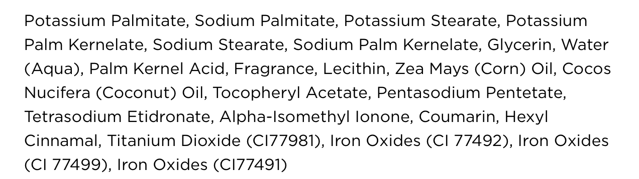 All ingredients: Potassium Palmitate, Sodium Palmitate, Potassium Stearate, Potassium Palm Kernelate, Sodium Stearate, Sodium Palm Kernelate, Glycerin, Water (Aqua), Palm Kernel Acid, Fragrance, Lecithin, Zea Mays (Corn) Oil, Cocos Nucifera (Coconut) Oil, Tocopheryl Acetate, Pentasodium Pentetate, Tetrasodium Etidronate, Alpha-Isomethyl Ionone, Coumarin, Hexyl Cinnamal, Titanium Dioxide (CI77981), Iron Oxides (CI 77492), Iron Oxides (CI 77499), Iron Oxides (CI77491)