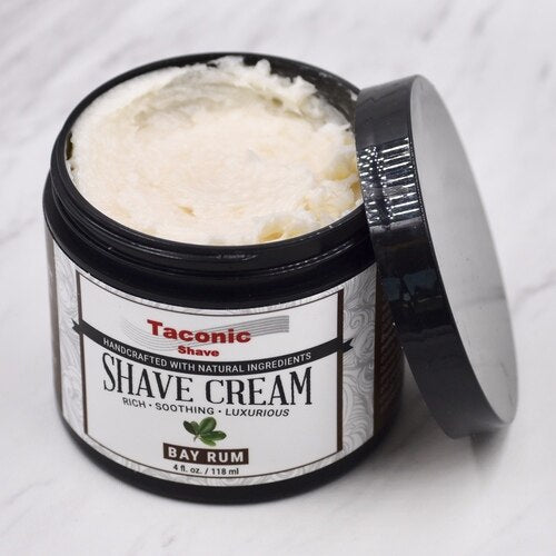 Taconic Shave's Bay Rum Shave Cream creates a lather that is rich, slick, luxurious and extremely long lasting. Our cream is made with many natural skin soothing ingredients to moisturize and protect your skin for improved razor glide. Our version of this classic masculine scent is hand crafted by our artisan soap makers with pure bay oil, a mix of spice and citrus essential oils, and honey for sweetness, giving it a warm, refreshing, spicy fragrance.