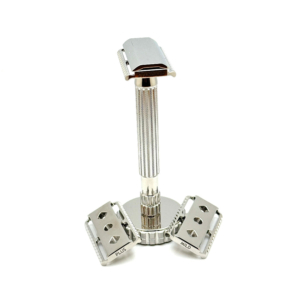 This is not a mass-market razor—it’s a refined instrument built for discerning shavers. The Vanguard adapts to your preferred shave style with three interchangeable base plates (sold individually or included as options), making it the most versatile and thoughtfully designed safety razor in our lineup.