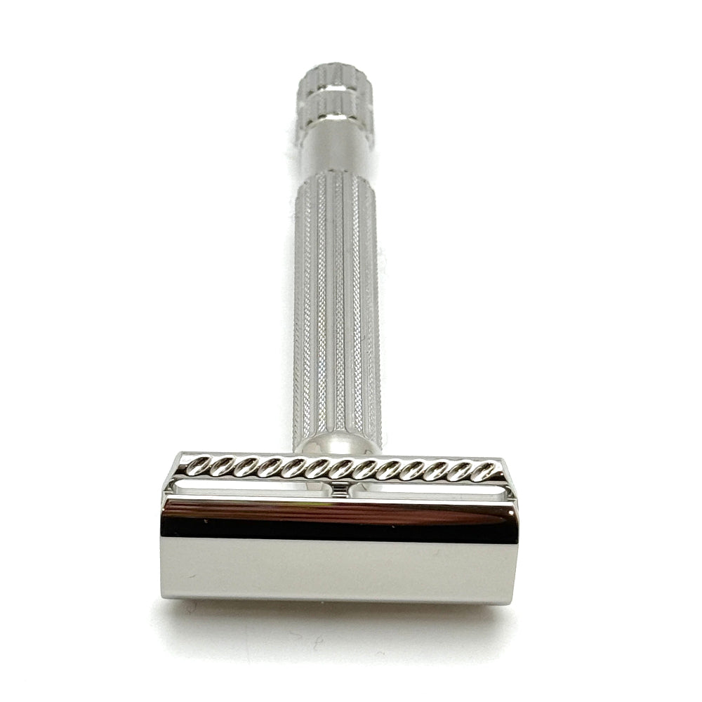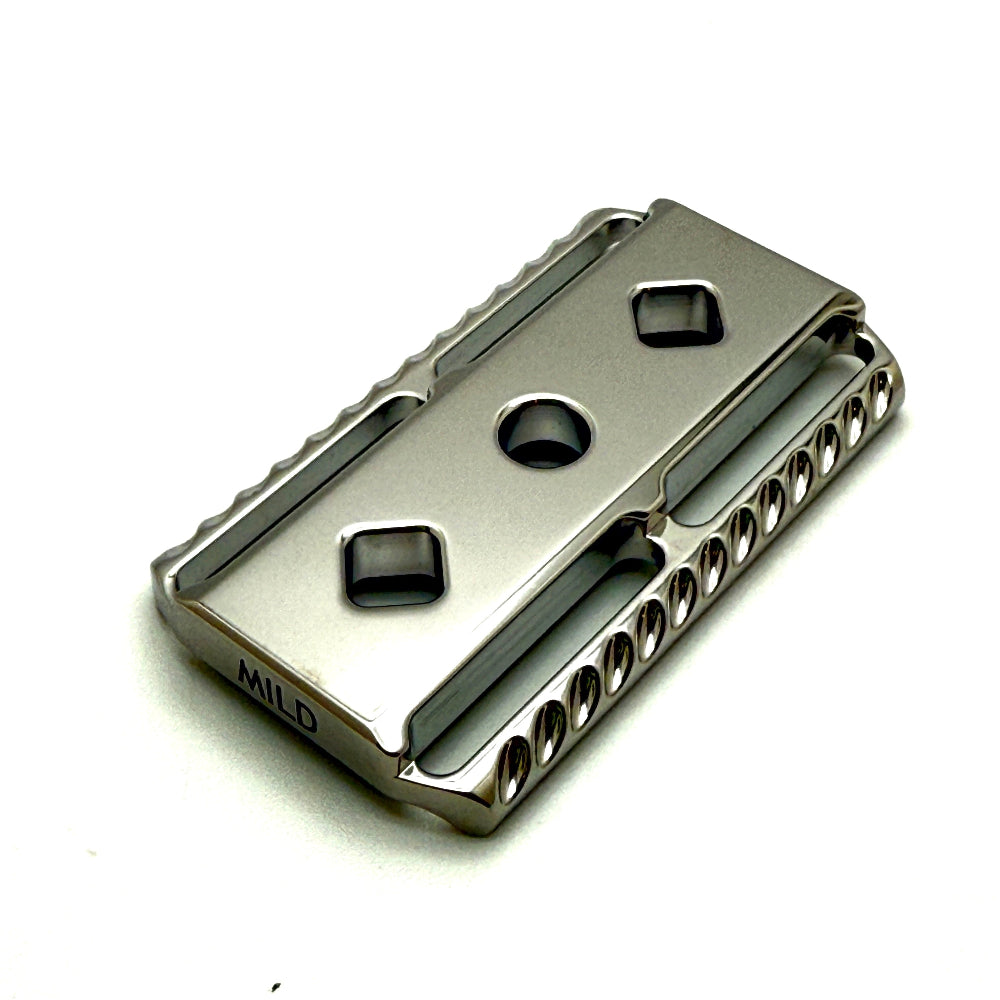 At 88 grams with a 3.5-inch (89mm) handle, The Vanguard offers impeccable balance—light enough for intuitive control, yet substantial enough for a steady hand. Finished with beveled safety bar edges and vintage-inspired diamond-shaped post holes, this razor is equal parts performance and craftsmanship.