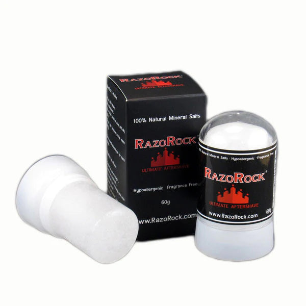 RazoRock is a multipurpose product, primarily used as a post-shave healer and antiseptic tool that is made from naturally occurring potassium alum mineral salts. It's antiseptic properties calm razor burn and soothe irritation, help to stop bleeding in the event of a minor nick or cut, and close skin pores leaving the skin smooth and tight.