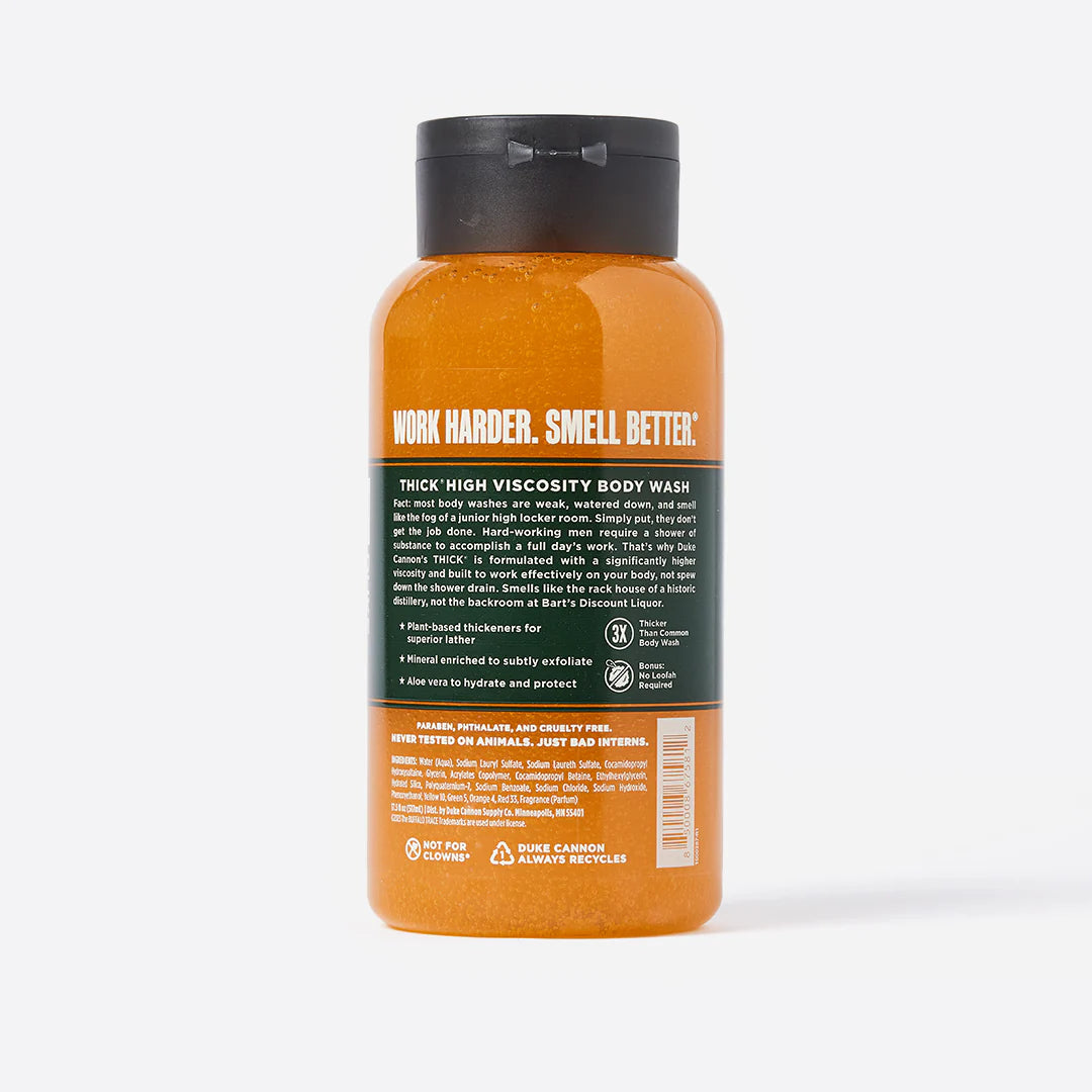 That's why Duke Cannon's THICK is formulated with a noticeably higher viscosity and built to work effectively on your body, not spew down the shower drain.