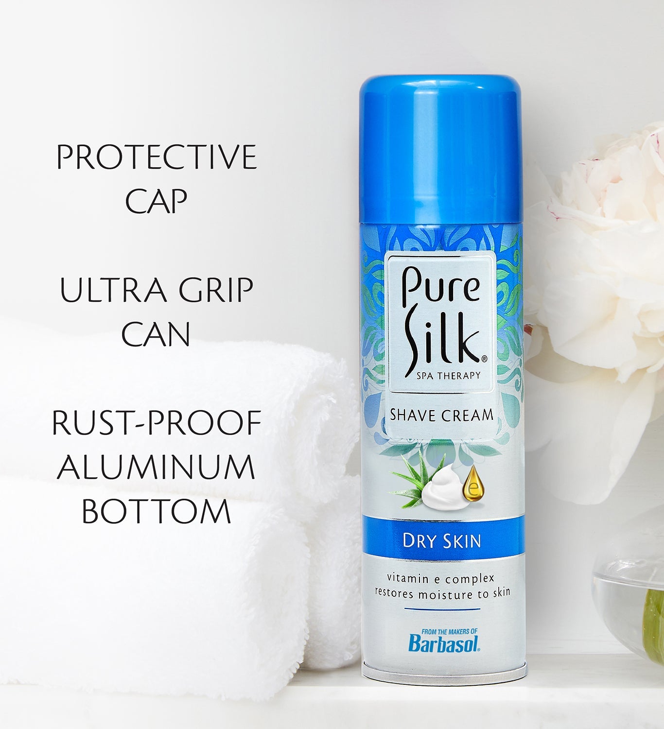 Formulated with vitamin E, aloe, lanolin and other moisturizing ingredients to restore and moisturize skin. Pure Silk Dry Skin Shave Cream protects and nourishes skin with a moisturizing smooth glide formula that leaves your skin looking, and feeling, as smooth as Pure Silk.