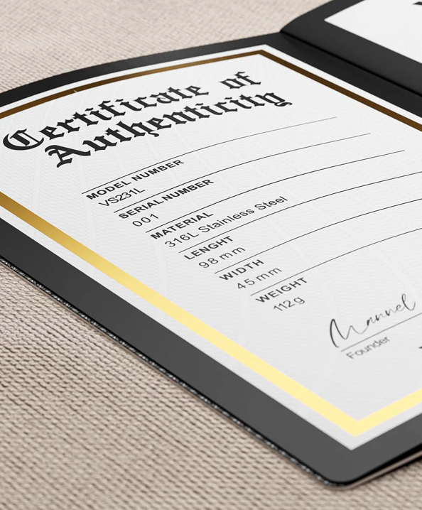 The Velocity-ONE is more than just a razor—it's an investment in quality, precision, and lasting value. Each razor comes with an engraved serial number, making every piece truly unique. Alongside this masterpiece, you’ll find a product pass with detailed information about your razor, presented in five languages.